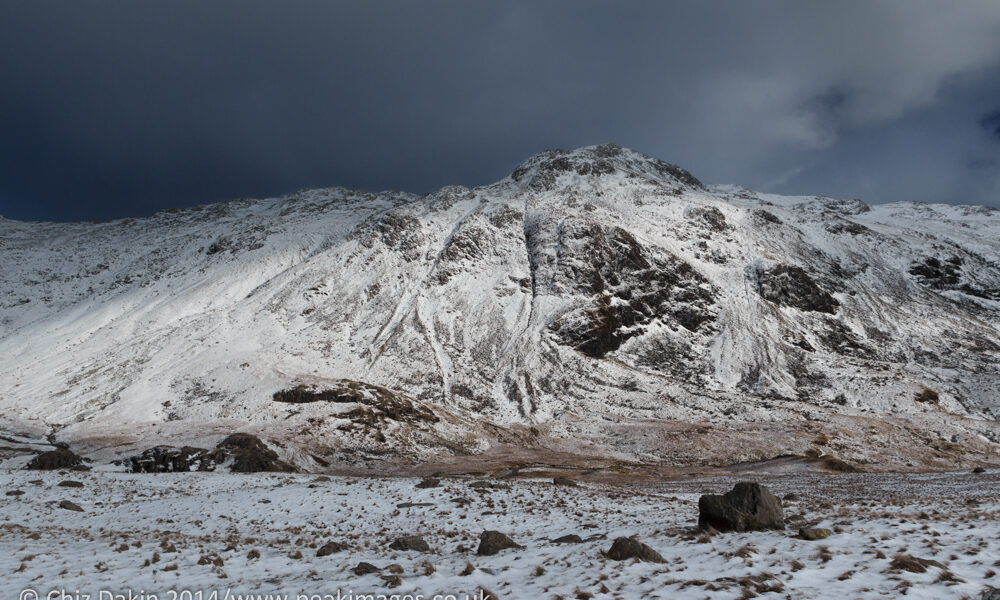 I make a calculated decision to take a “short-cut” across the corner of Mosedale – dropping down to the road much higher up. Of course, I’d forgotten the deep ravine created by the stream running parallel to the road. It probably would have been a lot quicker wading through the bog on the “main path” (which is anything but) to the road, than the windswept hunt for any safe route down from above the crags of Hardknott/Border End. Eventually I find the descent route to the summit of the pass – covered in snow it looks very different to when I’ve ascended it in the dark and rain on previous occaisions. And it’s nearly dark now.